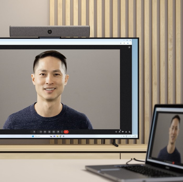 I den här lösningen tar du med din egen bärbara dator och kopplar in den till rummets utrustning. Vi installerar professionella kameror, högtalare och skärmar som ger betydligt bättre kvalitet än datorns inbyggda hårdvara.